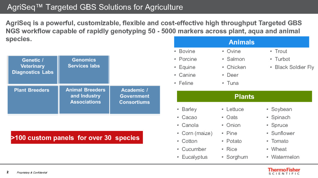 Технология AgriSeq представлена широким кругом задач, животных и растений которые можно изучать с ее помощью. Это достаточно мощный и гибкий, к тому же ресурсосберегающий инструмент для быстрого генотипирования различных организмов по количеству маркеров от 50 до 5000.