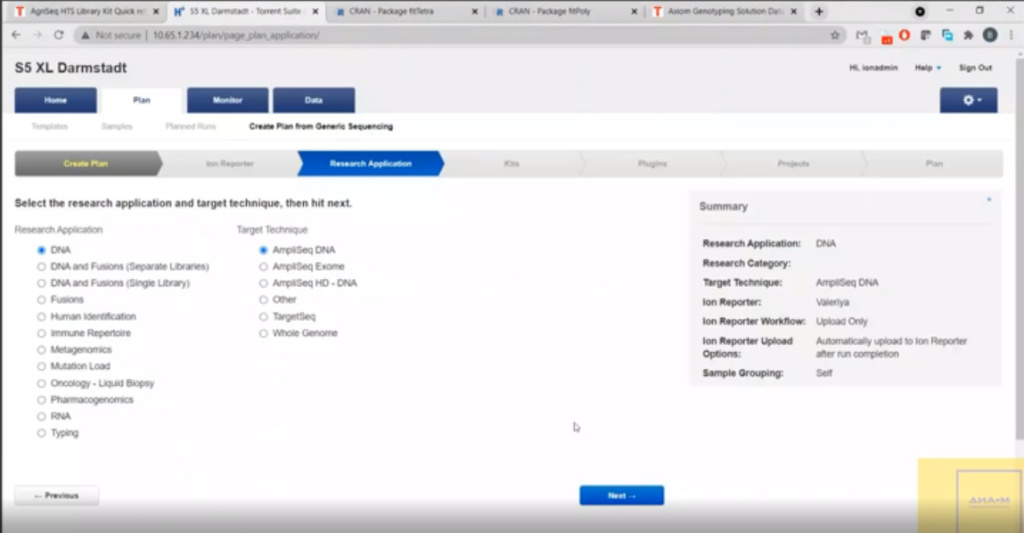 На следующей вкладке снова выполняем пошаговые настройки: указываем, что работаем с ДНК, указываем технику – AmpliSeq ДНК.