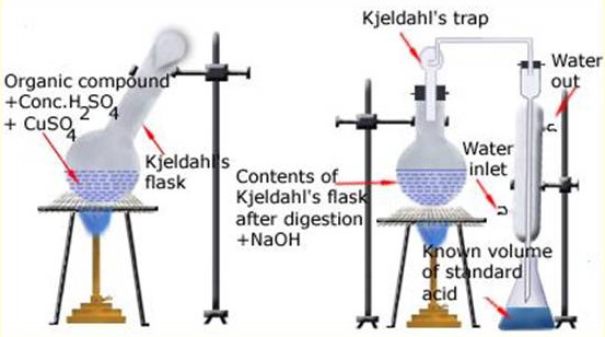 • на первом этапе метода происходит минерализация ("сжигание") пробы образца концентрированной серной кислотой в присутствии окислителя, инертной соли — сульфата калия и катализатора — сульфата меди. При этом аминогруппы белка превращаются в сульфат аммония, растворенный в серной кислоте. Данный этап является самым трудоемким и продолжительным (более часа);