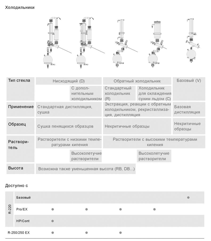 - R-220 Pro Continuous: один нисходящий холодильник и одна приемная колба объемом 10 л;
