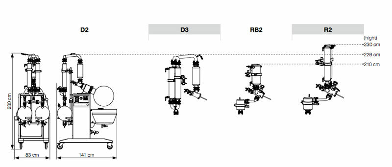- R-220 Pro Continuous: один нисходящий холодильник и одна приемная колба объемом 10 л;