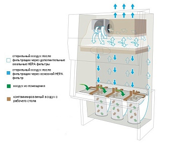 - равномерный, ламинарный, однонаправленный поток воздуха поступает на рабочую поверхность со скоростью 0,32 м/с и минимизирует кросс-контаминацию;