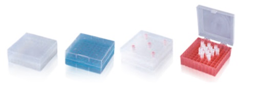 Криобокс Midea на 100 или 81 пробирку объемом 2 мл, выполнен из пропилена, размером — 133×133×53 мм, расположение на 100 пробирок : 10×10 или на 81 пробирку расположением пробирок: 9×9.