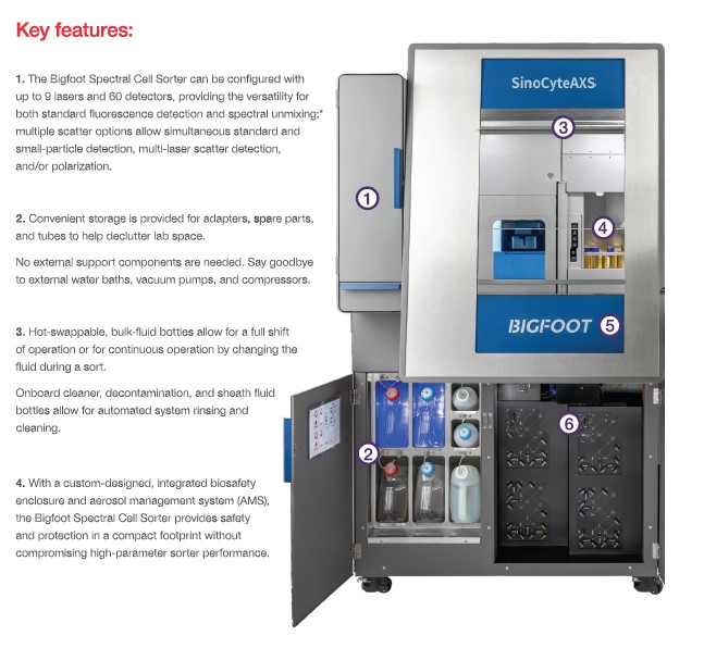 Конфигурации сортеров клеток SynoCyte ASX Bigfoot, предлагают как модели со спектральными детекторами, так и традиционными флуоресцентными детекторами.