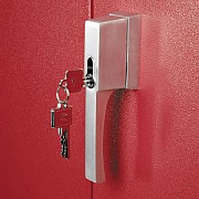 • изготовлен из листовой стали, покрытой порошковой краской, — красный цвет RAL 3003 (распашные двери) и светло-серый цвет RAL 7035 (основной каркас);