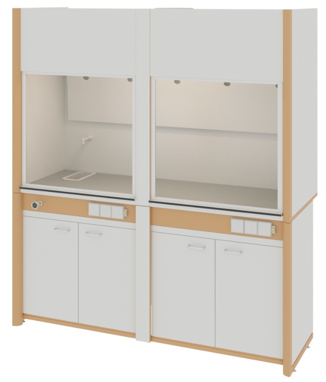 Шкаф вытяжной общего назначения, ширина 184 см, корпус – меламин, столешница – монолитный пластик Trespa, 2 подъемных экрана, раковина, 2 тумбы, ЛОиП