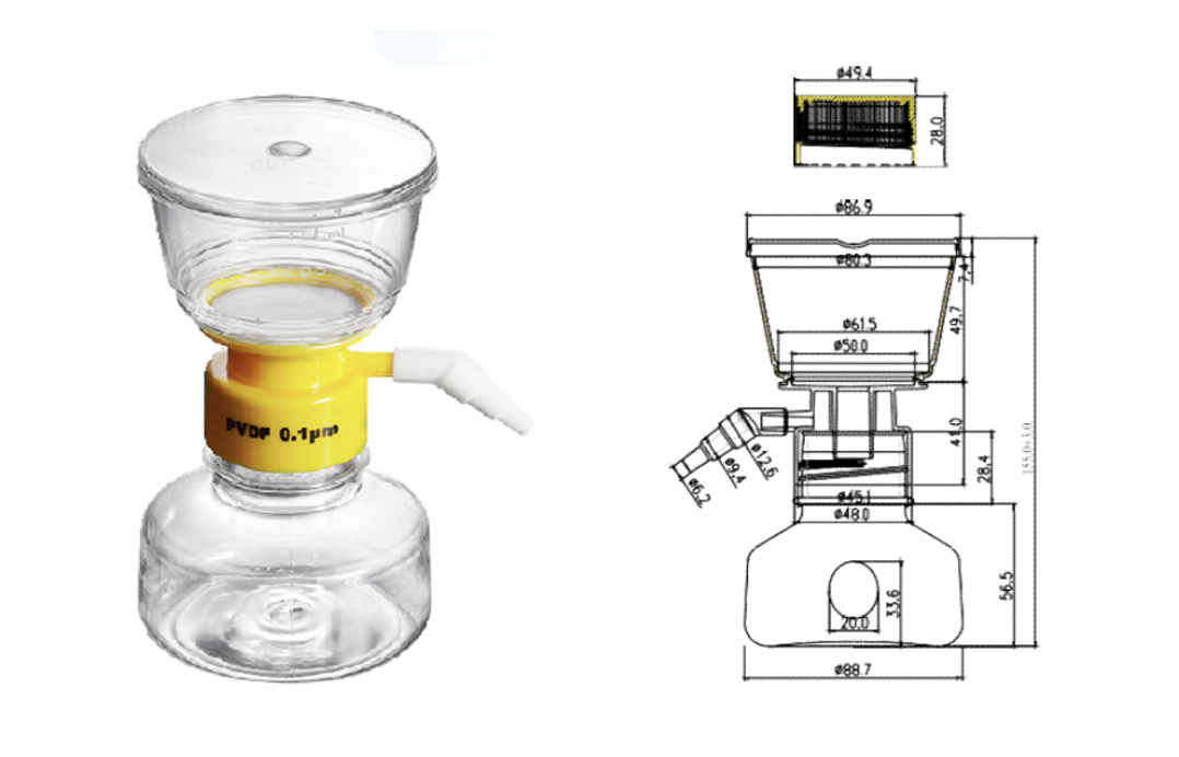 Комплект поставки: фильтр-воронка, встроенный фильтродержатель с мембраной, встроенный боковой вакуумный коннектор и приёмная бутыль.