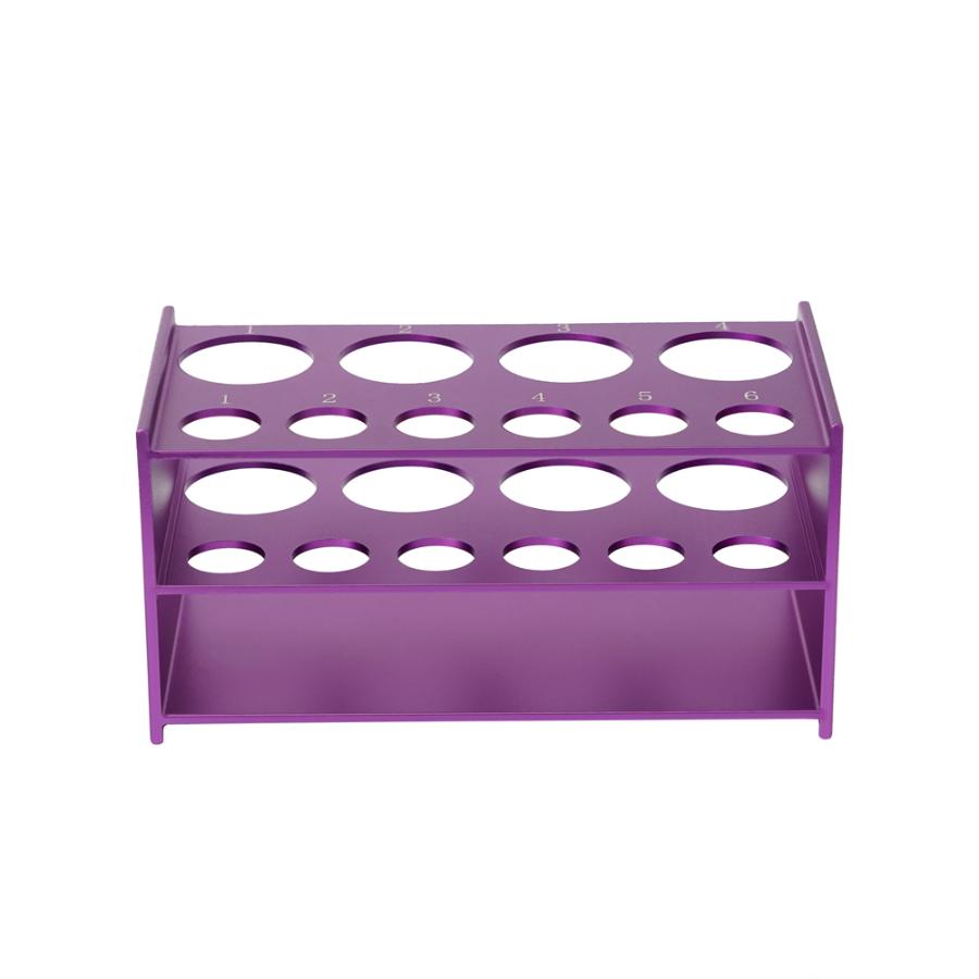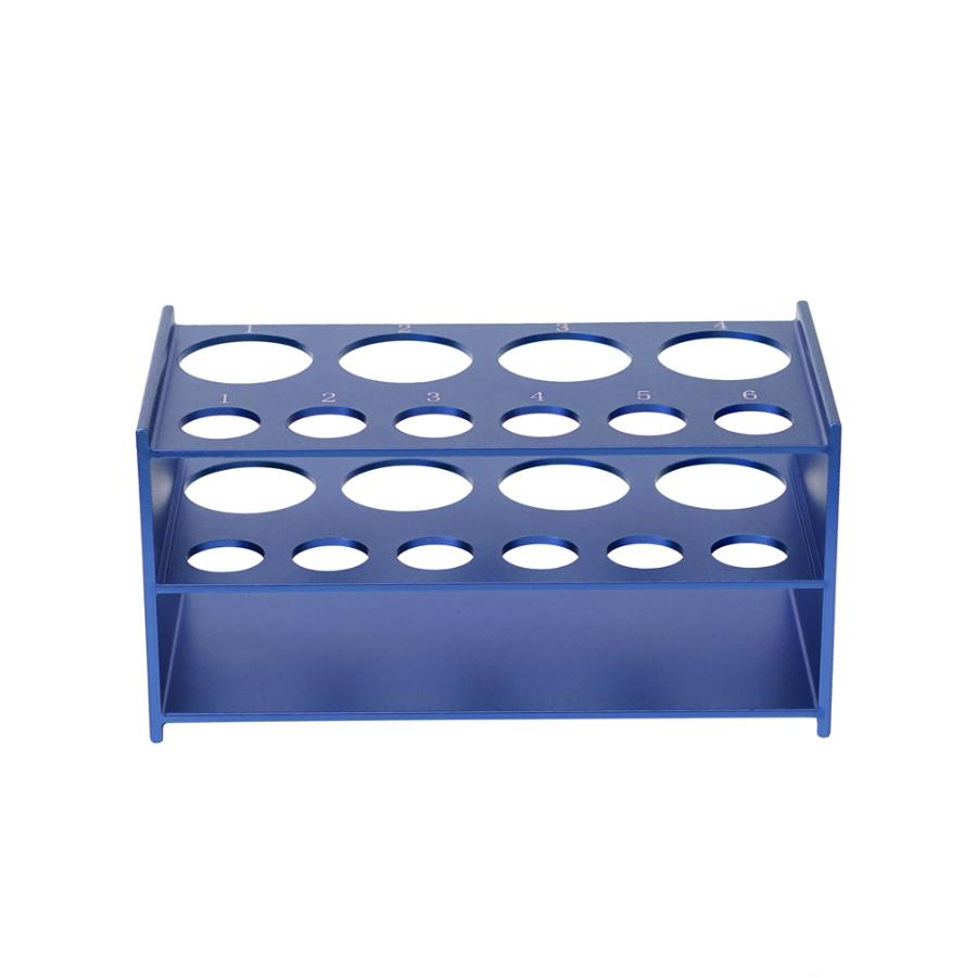 Штатив из алюминиевого сплава для 10 пробирок размером 17 и 30 мм в диаметре (или 15 и 50 мл, соответственно). Конструкция предусматривает устойчивые ножки для надежной фиксации на поверхности. Штатив обладает высокой устойчивостью к кислотам, щелочам и химической коррозии, а также хорошей теплопроводностью, что позволяет использовать его для кипячения и процессов экстракции. Доступные цвета: черный, серебристый, красный, темно-синий, голубой, фиолетовый, зеленый, золотой).