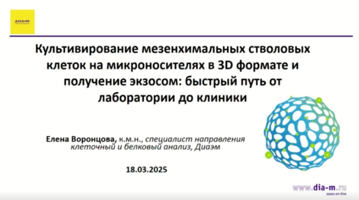 Культивирование мезенхимальных стволовых клеток на микроносителях в 3D формате и получение экзосом: быстрый путь от лаборатории до клиники, Елена Воронцова к.м.н., специалист направления клеточный и белковый анализ.