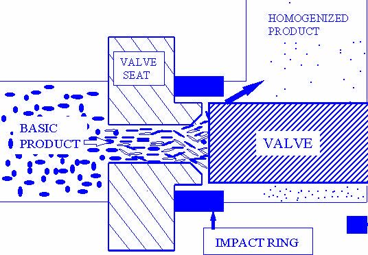 В основе конструкции — клапан гомогенизатора с возможностью регулировки зазора, через который, мощный насос непрерывно прокачивает весь поток жидкости. Уменьшение зазора в клапане приводит к возрастанию давления и появлению физических эффектов (напряжение сдвига, кавитация, турбулентность), совокупное воздействие которых приводит к дроблению частиц.