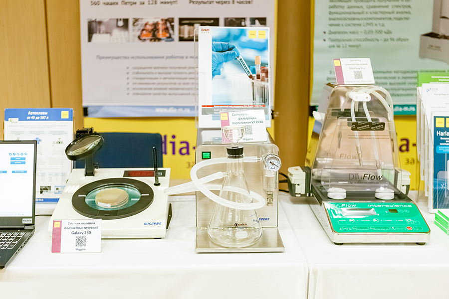 Участникам был предложен широкий выбор приборов: от ручных счетчиков Galaxy 230 до автоматизированных систем стерилизации и вакуумной фильтрации. Особый интерес заслужили гомогенизаторы лопаточного типа BagMixer для подготовки проб и многопозиционные платформы вакуумной фильтрации BioVac, значительно ускоряющие работу лабораторий микробиологического профиля.