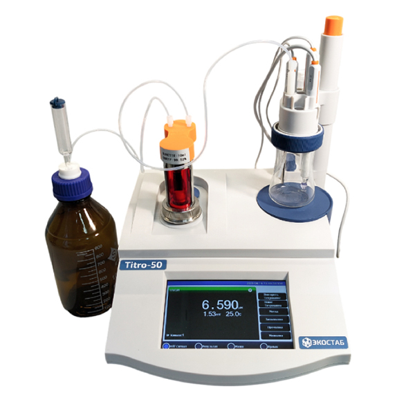 Титратор со встроенным дозирующим модулем разрешением 30000 шагов, магнитной мешалкой, стендом титрования и сенсорным терминалом управления размером 7 дюймов. Возможность использования пользовательских алгоритмов расчета. 14 ярлыков быстрого запуска на рабочем столе. Функция управления пользователями (до 8 пользователей) с защитой паролем. Возможность подключения дополнительного дозирующего модуля и автоподатчика на 11 образцов. Языки встроенного программного обеспечения: английский, китайский. Характеристики титратора Titro-50