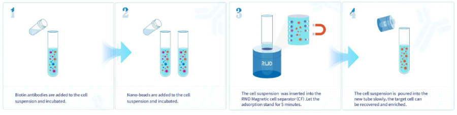 Продукты для разделения клеток RWD включают в себя наборы для разделения клеток с магнитными микрошариками и колонки для разделения клеток, которые позволяют проводить сепарацию с высокой чистотой и высокой жизнеспособностью за счет простой работы. Наноразмерные магнитные шарики не требуют элюции, а разделенные клетки можно напрямую использовать в последующих экспериментах, таких как проточная цитометрия, культивирование клеток, секвенирование отдельных клеток и т.д. Преимущества набора для магнитной сепарации RWD