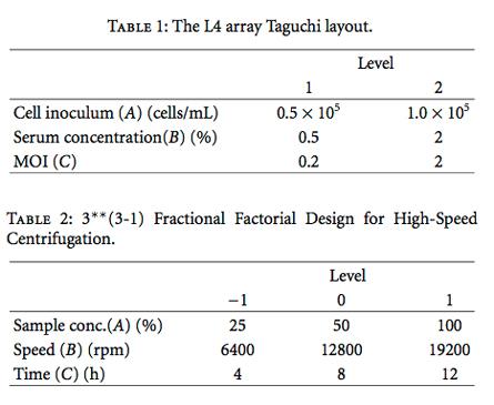 2.8. High-Speed Centrifugation. Harvested virus sample was diluted using phosphate buffer saline (PBS) into three different concentrations: 25%, 50%, and 100% (v/v). About 1.8 g of Polyethylene Glycol 600 (PEG) was added into 40 mL of each virus sample and stirred in a sealed centrifuge tube at 4◦C for 4 hours. After 4 hours, samples were centrifuged at 4◦C at designed speed and time. After that the pellet for each sample was resuspended in 0.4 mL PBS and transferred into a centrifuge tube. The suspended pellet was later sonicated for 30 seconds until aggregates were disrupted. The debris was then spinned out at 14 000 rpm for 10 minutes. HA test was performed to determine the final titer. 2.9. Haemagglutination Assay (HA) Test. The haemagglutination assay (HA) method described by Grimes [19] was used. Using a 96-well V-shaped microtiter plate, 50 μl PBS was added from wells 2A–12A. One hundred microlitres of virus sample was added to well 1A to which 50 μl of it was serially diluted up to well 11A. Fifty microlitres of 1% red blood cell (RBC) was added to all wells. Agglutination of RBC was observed in wells containing the virus while clumping of RBC was seen in wells containing no virus. Dilution of the last well showing agglutination gave the titer of the virus sample. Haemagglutination units were multiplied by 20 and, therefore, expressed per mL as HAU/mL. 2.10. TCID50 Assay. Fifty percent tissue culture infectious dose (TCID50) assay was carried out in 96-well flat shaped microtiter plates. Plates were seeded with Vero cells such that confluence was reached in 2-3 days. Vero cells were grown in DMEM media containing 10% FBS and grown at 37◦C, 5% CO2. Appropriate dilutions of each virus were prepared in DMEM medium and 100 μl of each dilution was added to each well. Plates were incubated at 37◦ C for 30–60 min before 100 μL of DMEM was added to each well. The plates were then incubated for 4 days until the CPE effect was appeared. The log TCID50/mL calculation was based on the Reed and Muench [20] formula. 2.11.Taguchi’s Orthogonal Design. TaguchiL4 array was used to design NDV production in bioreactor experiments. Three factors that were chosen to be manipulated in four runs of experiment are size of cell inoculums, serum concentration during virus production phase, and multiplicity of infection, MOI. The levels of the factors studied and the layout of the L4 Taguchi’s orthogonal array are shown in Table 1. 2.12. Fractional Factorial Design. 3**(3-1) Fractional Factorial Design was used to assist high-speed centrifugation experiments. Three factors that were chosen to be manipu- lated in nine runs of experiment are sample concentration, speed, and time. The levels of the factors studied and the layout of the fractional factorial design are shown in Table 2.